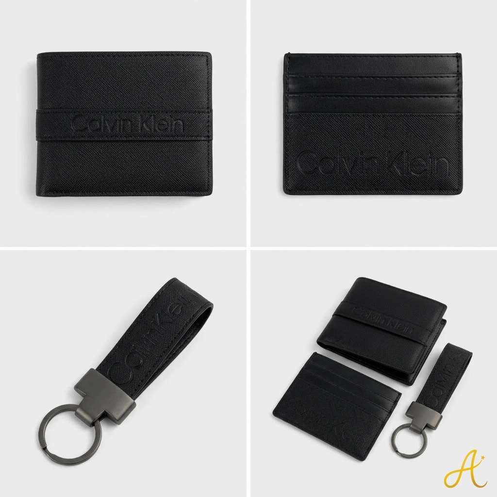 Get the authentic Calvin Klein men's 3-piece set. Features a black leather wallet, card holder, & keychain in a sleek gift box. Upgrade your accessories today!